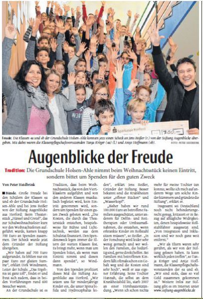 An der Grundschule ist es bereits seit vielen Jahren Tradition, dass beim Weihnachtsstück, dass von den Viertklässlern aufgeführt und von den anderen Klassen musikalisch begleitet wird, kein Eintritt genommen wird, sondern um Spenden für einen guten Zweck gebeten wird. Den Spendenzweck legen immer die Eltern der Viertklässler fest. Zur Vorbereitung auf das ComedyKino 2017 gab es ein großes Interview in der LIFE – das Stadtmagazin aus Bünde. Dieses Interview wurde von den Eltern der vierten Klassen gelesen und man entschied sich, die Einnahmen der Weihnachtsaufführung der Stiftung Augenblicke zukommen zu lassen.