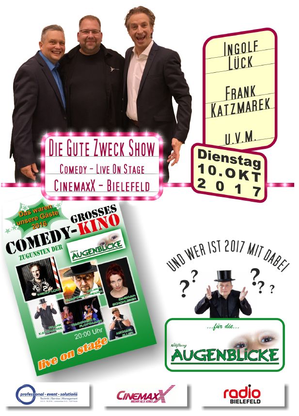 Das 1. große ComedyKino im Cinemaxx in Bielefeld 2016 war ein großer Erfolg. Daraufhin haben wir uns mit dem Cinemaxx in Bielefeld und der Firma Professional Event Solutions GmbH aus Bünde zusammen darauf geeinigt, den Erfolg in 2017 wiederholen zu wollen und vlt. sogar eine jährliche Wiederholung zu starten. Der nächste Termin wird am 10.10.2017 wieder im Cinemaxx in Bielefeld am Boulevard stattfinden. Aktuell werden Künstler gesucht, die für die gute Sache einen kleinen Ausschnitt aus Ihrem Programm präsentieren möchten, damit der Abend wieder ein bunter und abwechslungsreicher Comedyabend wird. Wir freuen uns schon sehr auf einen unvergesslichen Abend mit vielen tollen Künstlern und vor Allem wieder hoffentlichen vielen Zuschauern.